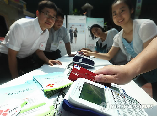 11일 오전 서울 송파구 잠실동 롯데월드 가든스테이지에서 열린 '대한적십자사 희망풍차 나눔 페스티벌'에서 유중근 대한적십자사 총재(가운데)를 비롯한 참석자들이 신용카드로 기부를 한 후 기념촬영을 하고 있다.
